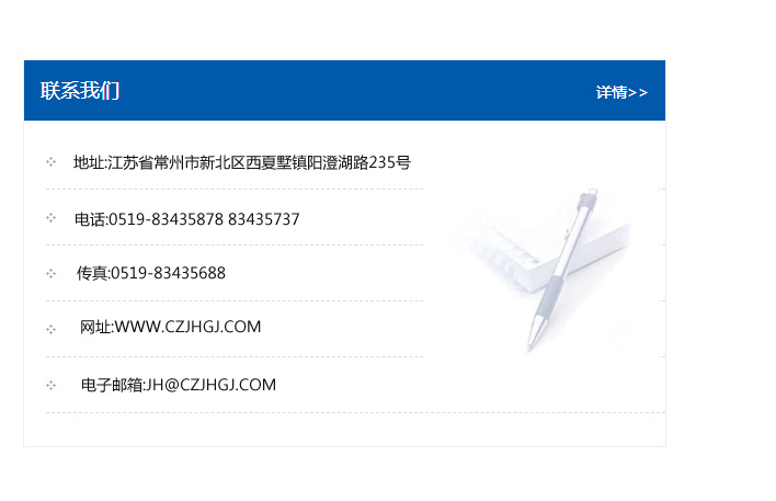 地址:常州市新北區友邦商務大廈1幢16、17層  電話:0519-85101652  傳真:0519-85112595  郵編:213022  網址:www.cz-jiayue_cn.wuhujiaxing.com  郵箱:xiajifengaa@163.com